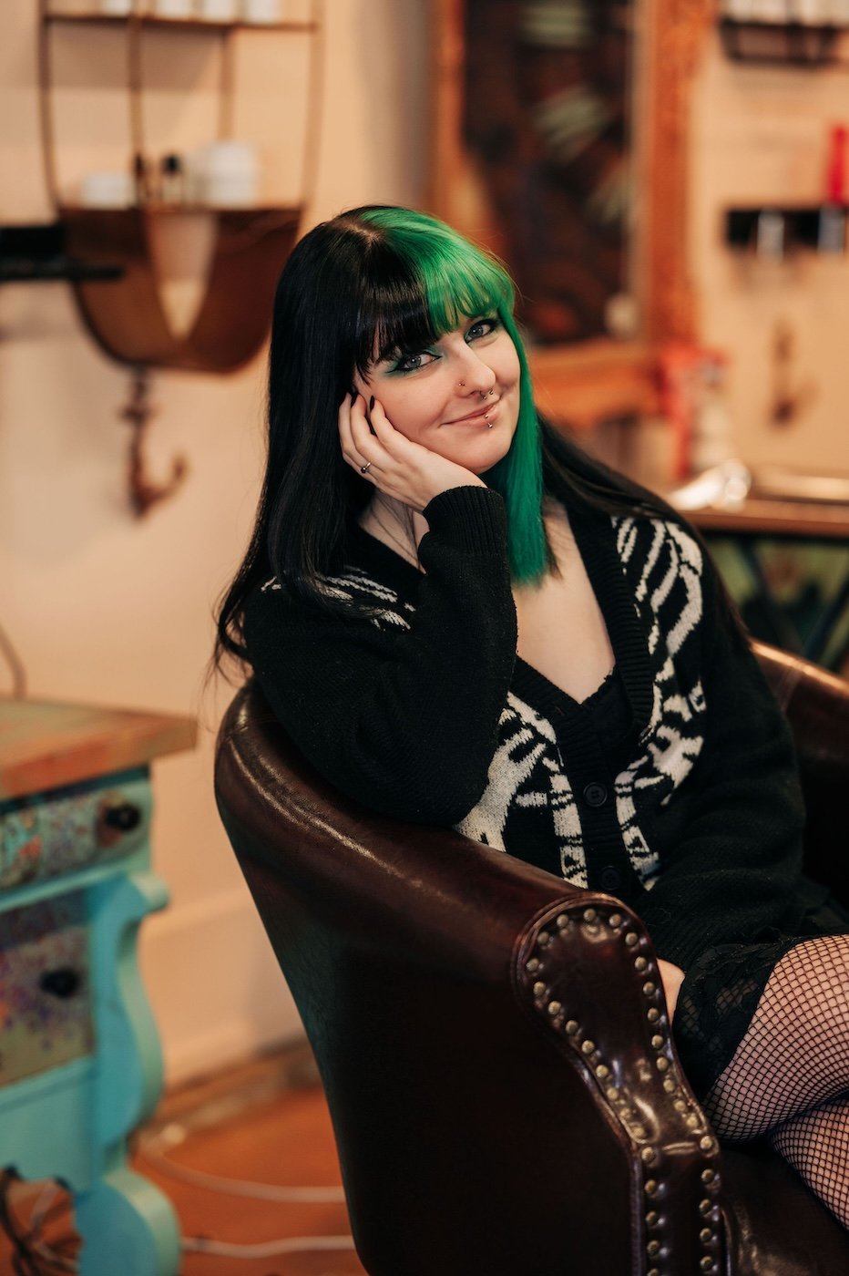 Meet Kayla: our green-haired goddess, the new kid on the block, and the official it girl you didn’t know you needed. She’s got cosplay energy, a love for anything green, and the heart of a former emo kid — which means yes, she absolutely gets it.